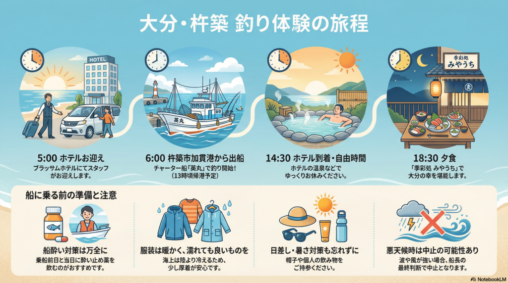 | 6:00 | 港到着・出船 | 大分県杵築市加貫港の遊漁船「英丸(ひでまる)」さんをチャーター予約しました。船長さんとも調整しますが、だいたい13時くらいには港につく形にしようと考えています。※釣り道具やライフジャケットの準備はこちらで準備します。 | 遊漁船 英丸 |