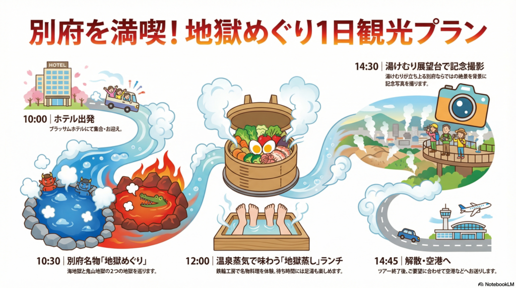 | 10:30 | 別府 地獄めぐり | 海地獄→鬼山地獄 | 地獄 |